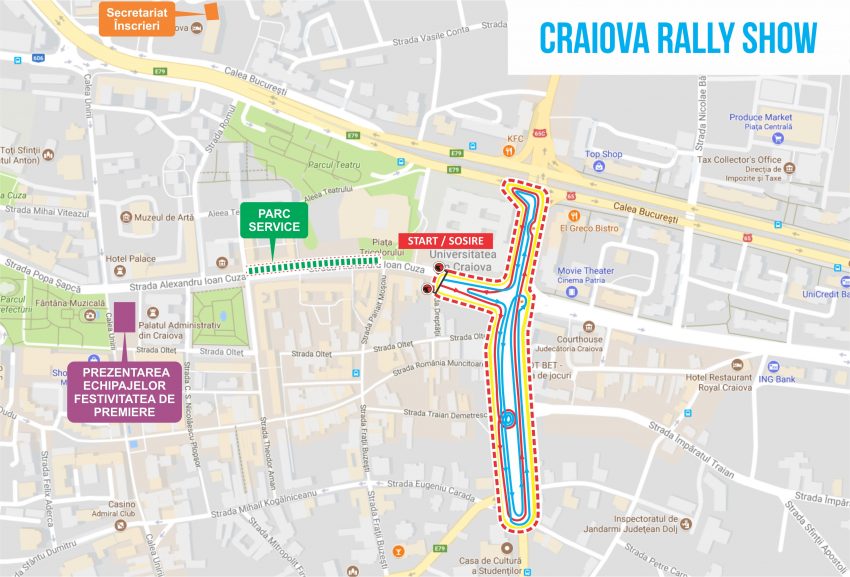 Piloții ce și-au prezentat vineri mașinile în Piața Mihai Viteazul, s-au întrecut sâmbătă pe un traseu lung de 1,5 km ce a inclus și Pasajul subteran de la Universitate cu o lungime de 405,32 m. Dacă la Monte Carlo se poate, de ce ar fi oltenii mai prejos?! aspect remarcat și de pilotul Mihai Leu, fost campion modial la box, care a apreciat traseul. În concurs, piloţi din toate genurile de competiţii auto – raliu, coastă, karting şi off-road, cu licențe FRAS/FIA, au fost cronomentrați pe parcursul unui tur de circuit.
