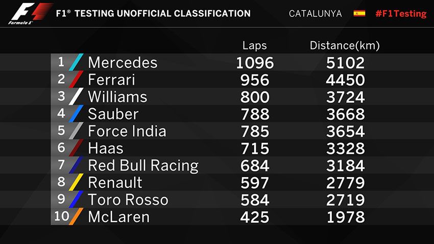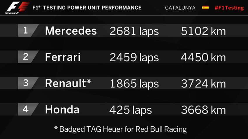 După cum se poate vedea mai jos, mașinile cu motoare Mercedes (Mercedes, Williams, Force India) au adunat cei mai mulți kilometri urmate de cele cu motoare Ferrari (Ferrari, Haas, Sauber). Cu un pas în spate au fost echipele cărora Renault le asigură motorizarea (Renault, Red Bull, Toro Rosso) cu Honda (McLaren) încheind plutonul.