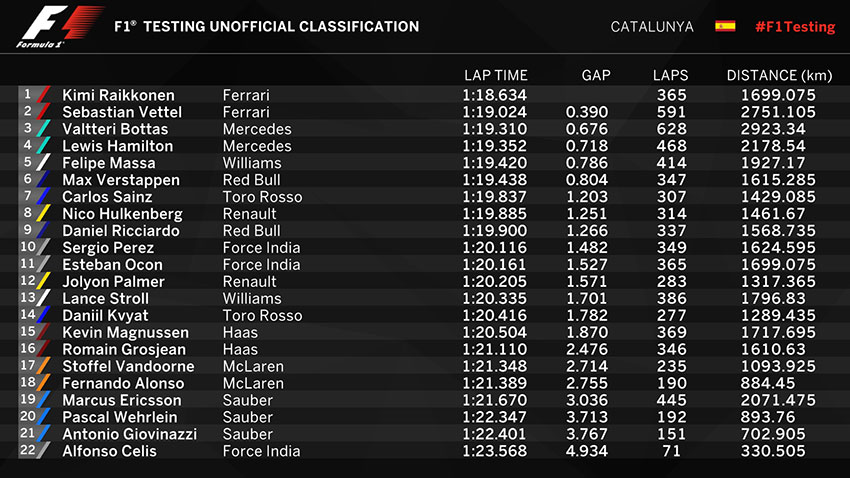 Ferrari au setat timpii de referință, Kimi Raikkonen fiind singurul care a coborât sub 1m19s pe circuitul Barcelona - Catalunya. Comparativ cu timpul reușit de Lewis Hamilton în 2016 când a caștigat pole position-ul cu 1m22s, finlandezul a imbunătățit performanța cu peste 3 secunde. Scuderia a fost urmată de Mercedes, Williams și Red Bull, toate cu sub o secundă de Raikkonen cu Toro Rosso conducând echipele din a doua jumătate. Doar două echipe au terminat la peste două secunde: McLaren și Sauber.