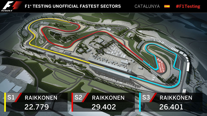 Kimi Raikkonen a stabilit cei mai buni timpi ai iernii pe fiecare dintre cele trei tronsoane ale circuitului de lângă Barcelona. Dacă le-ar fi adunat într-un singur tur, timpul său ar fi fost de 1m 18.582 secunde, o îmbunătățire cu doar 0.052 secunde față de cel mai rapid tur pe care l-a realizat. Impresionant!
