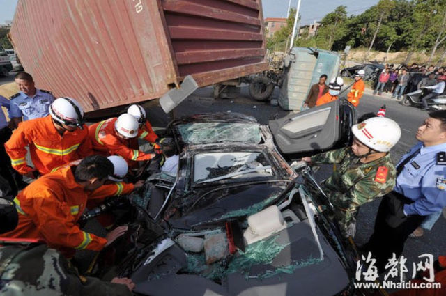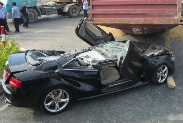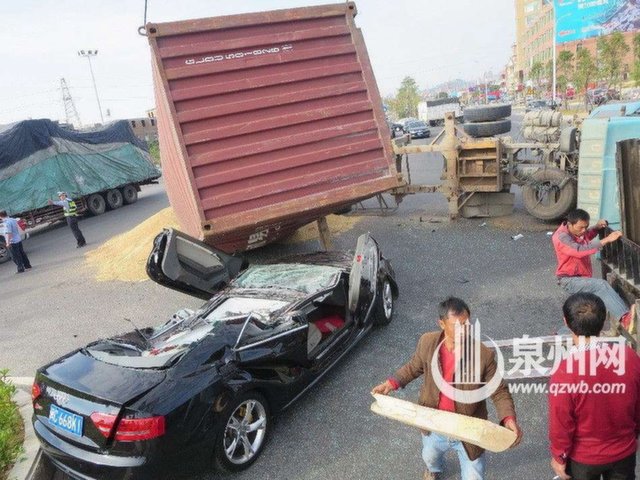 Doi pasageri ai unui Audi S5 au scăpat ca prin minune doar cu câteva răni uşoare, după ce un container plin cu marfă a căzut de pe un TIR peste maşină. Accidentul s-a petrecut în oraşul chinez Quanzhou, iar maşina a fost strivită aproape complet de greutatea containerului.