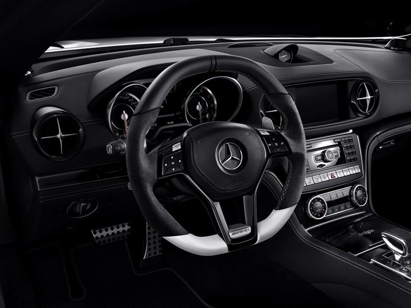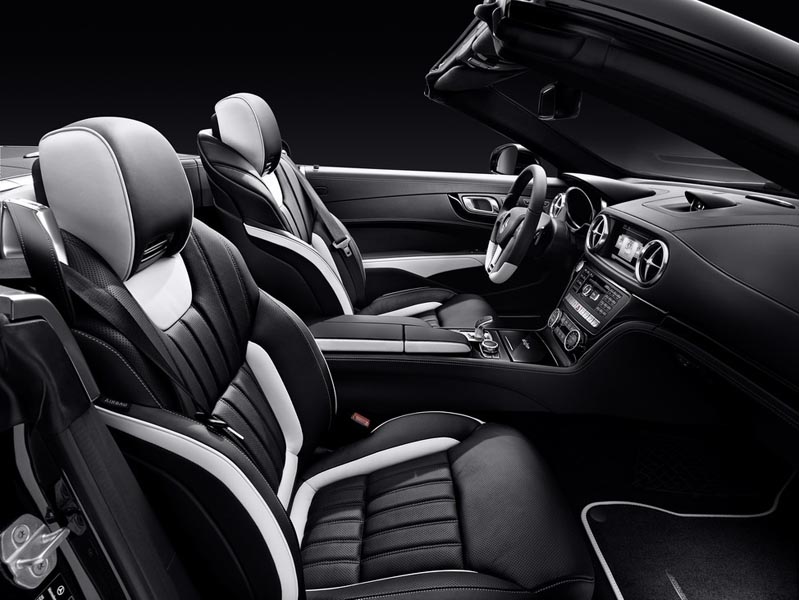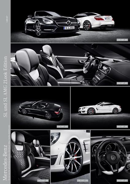 Ediţia SL 2LOOK este disponibilă în nuanţele alb caşmir, alb diamant, gri sau argintiu, are un acoperiş în culori contrastante – negru, negru “obsidian” sau negru “magnetite” şi jante de 19 inch. Tema în două culori se continuă şi la interior, acolo unde scaunele sunt îmbrăcate în piele Nappa neagră şi albă, ornamente negre şi dotări opţionale ca AIRSCARF sau pachetul Active Multicontour Seat. Pachetul 2LOOK Edition va fi disponibil pe mai multe modele şi va fi oferit în cele din urmă şi pe SL 63 AMG şi SL 65 AMG, cu câteva mici modificări.