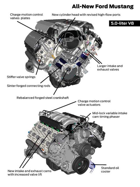 Ca motorizare de vârf, Ford oferă un V8 de 5 litri, care produce 420 de cai putere şi 528 Nm cuplu. Indiferent de motorizarea pentru care clienţii vor opta, aceasta va fi cuplată cu o transmisie manuală sau automată. Puterea va fi transmisă, în mod tradiţional, punţii spate.