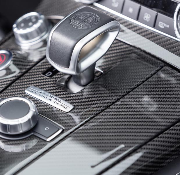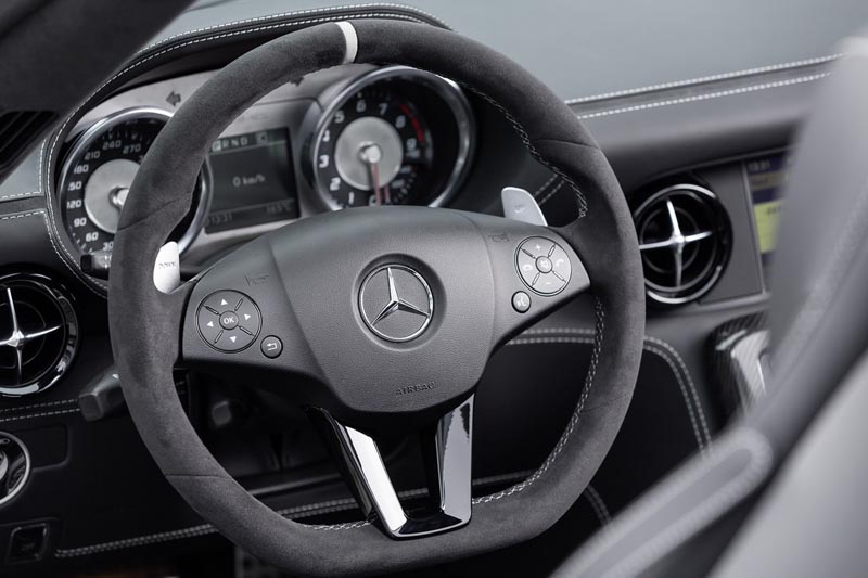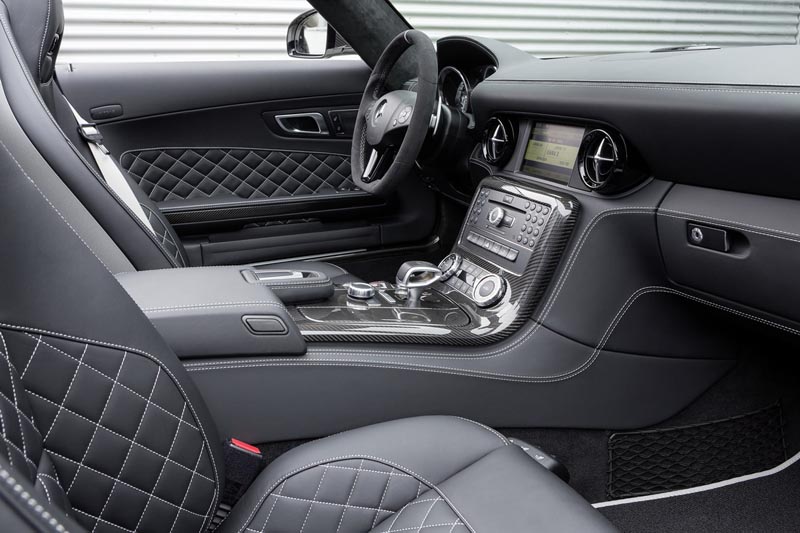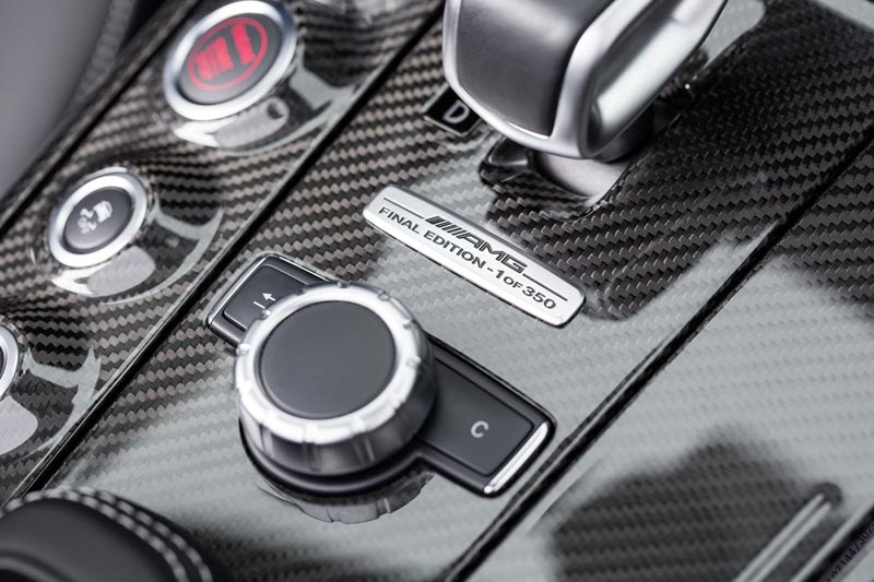 La interior, ediţia limitată SLS AMG GT Final Edition a primit piele din belşug, cu un model în formă de diamant şi cusături argintii care contrastează cu pielea de culoare neagră. Mai multe elemente din fibră de carbon, centuri de siguranţă argintii sau o consolă centrală din fibră de carbon pe care se află o plăcuţă inscripţionată cu un număr unic pentru fiecare maşină, sunt alte elemente pe care viitorii norocoşi posesori le vor găsi la interior.